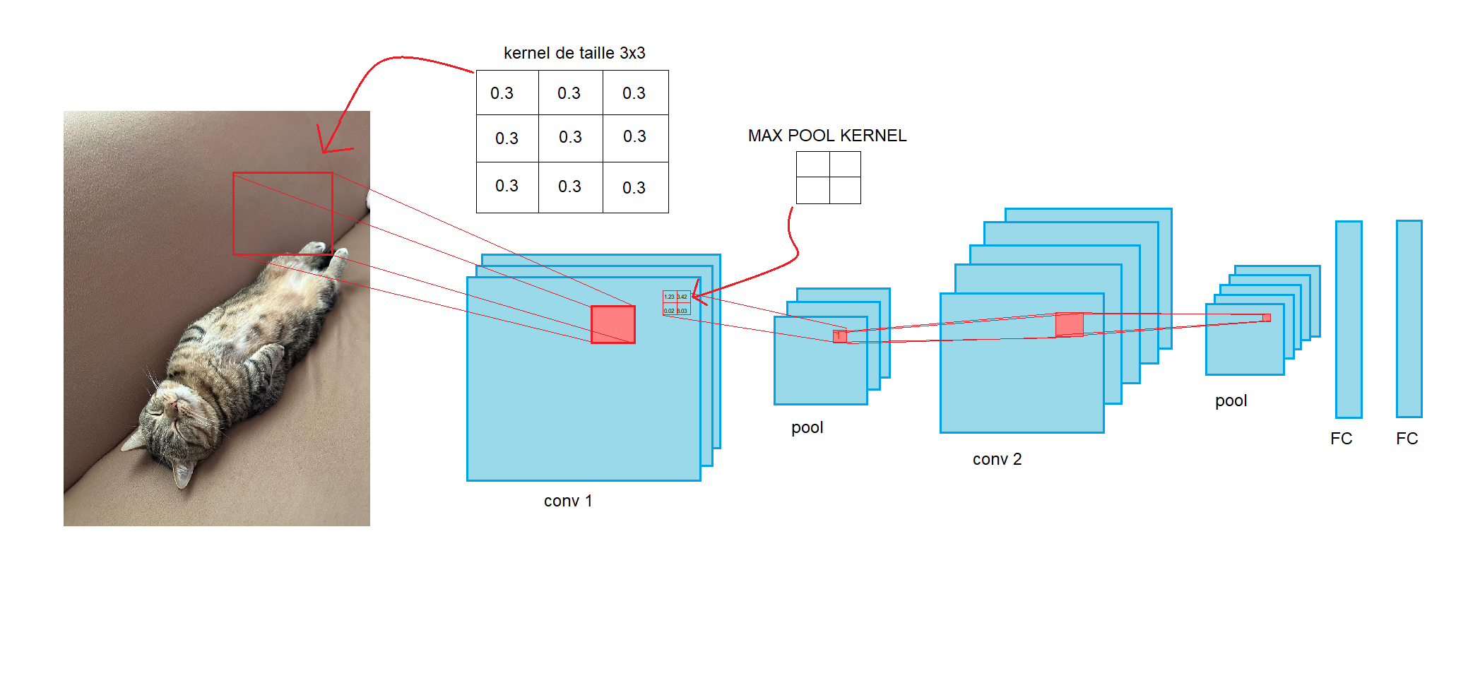Sur l'image des architectures, il y plusieurs couches FC connectés après toutes nos couches de convolution et pooling. Ces couches FC sont des réseaux de neurones artificiels simples comme vu dans les articles précédents.