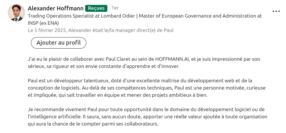 Ce que j'ai dit parle surement pas à tout le monde mais c'est un caractère chez moi. Je suis perseverant et sérieux (j'aime bien déconner aussi 🤫) et avec assez d'effort fini par y arriver. C'est pour ça que je me suis lancé dans le freelance et envisage par la suite de continuer dans l'entrepreunariat et le monde des startups. Donc si vous avec un projet et recherchez un profil comme le miens, hésitez pas à me contacter: paulclaret4@gmail.com