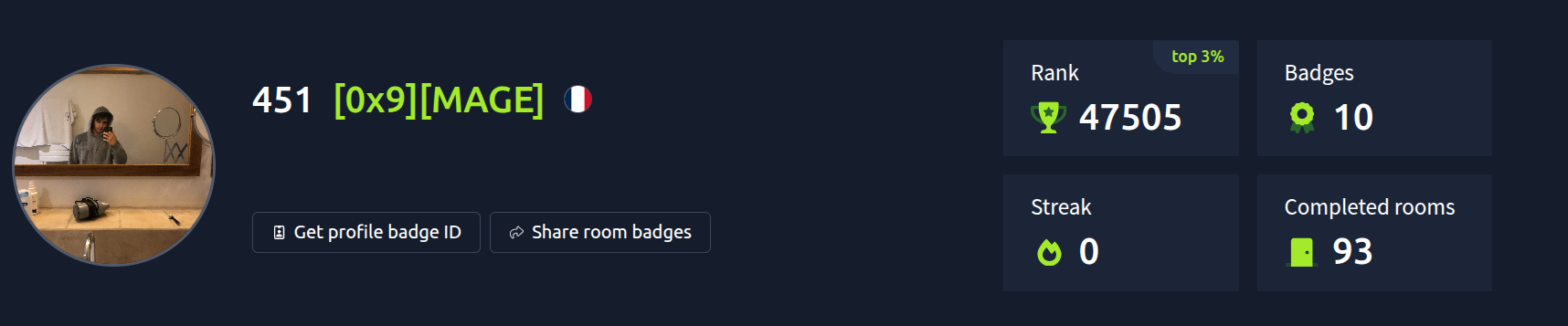 Bien que j'aimerai bien passer des certifications comme Comptia, aws cloud architect etc, je n'en ai pas fait puisqu'il faut encore payer. Mais j'ai un classement top 3% sur la platforme TryHackMe (avant j'était top 1% mais inactif depuis 2 ans 🙃)